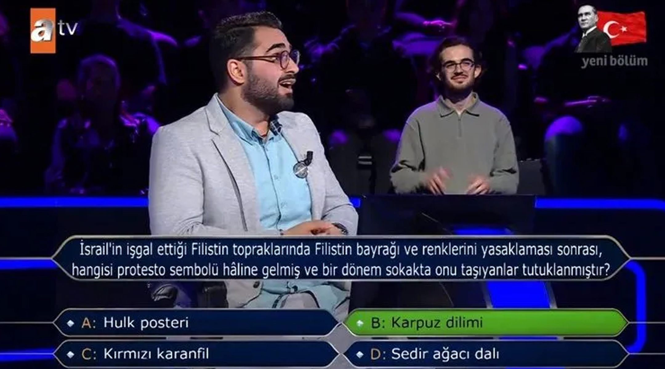Kim Milyoner Olmak İster: İsrail’in işgal ettiği Filistin topraklarında Filistin bayrağı ve renklerini yasaklaması sonrası, hangisi protesto sembolü haline gelmiş ve bir dönem sokakta onu taşıyanlar tutuklanmıştır? – – Kim Milyoner Olmak İster’de 1 Milyonluk Filistin Sorusu ATV’nin sevilen bilgi yarışması Kim Milyoner Olmak İster, Kenan İmirzalıoğlu’nun sunumuyla ekranlara geldi.